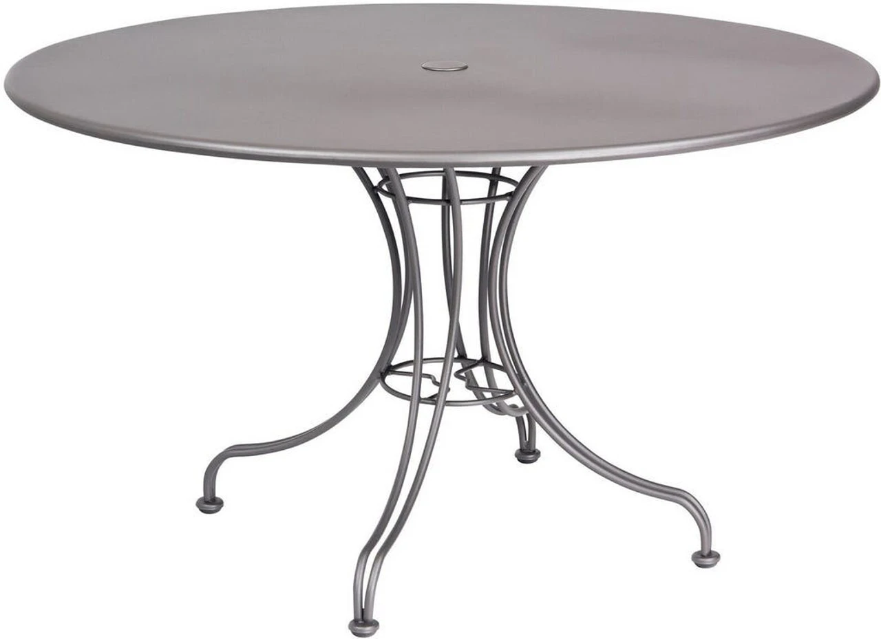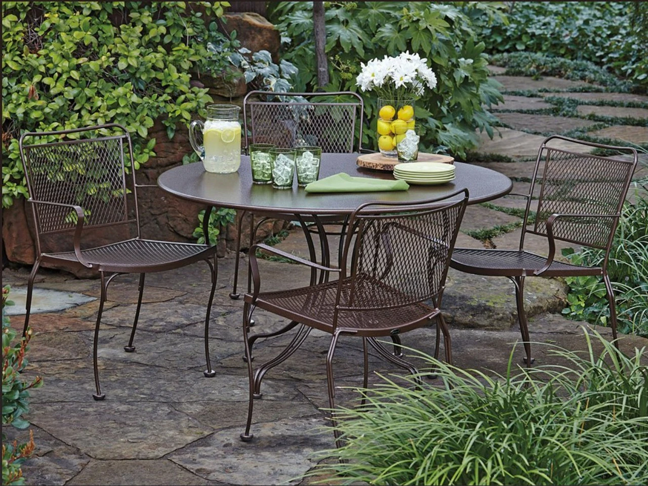 Our Woodard Constantine Dining Set comes with: (4) Constantine Stackable Dining Armchairs & (1) 48″ Solid Top Wrought Iron Dining Table