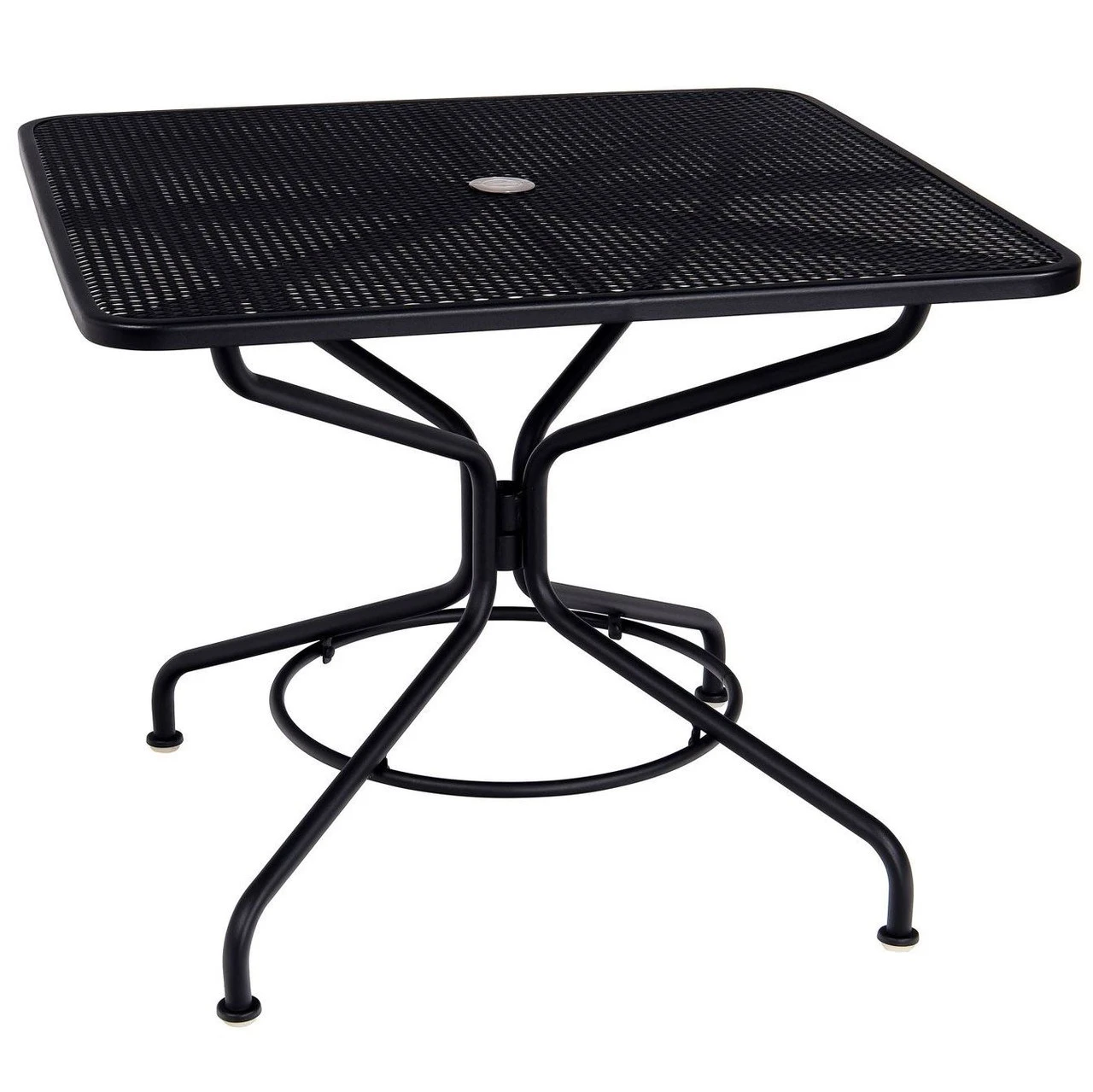 This mesh-top wrought iron umbrella table from the Wrought Iron Cafe’ Series by Woodard Furniture is a versatile choice for outdoor patio or deck dining settings from Outdoor Furniture Plus. The diameter is 36.5 inches, and Woodard’s table carries a 15-year warranty. Order yours in a textured black finish, and start sending those dinner invitations. Our expert staff can assist you in selecting a patio umbrella and all-weather furniture or cushioned wicker dining chairs. Woodard In-Stock Collection