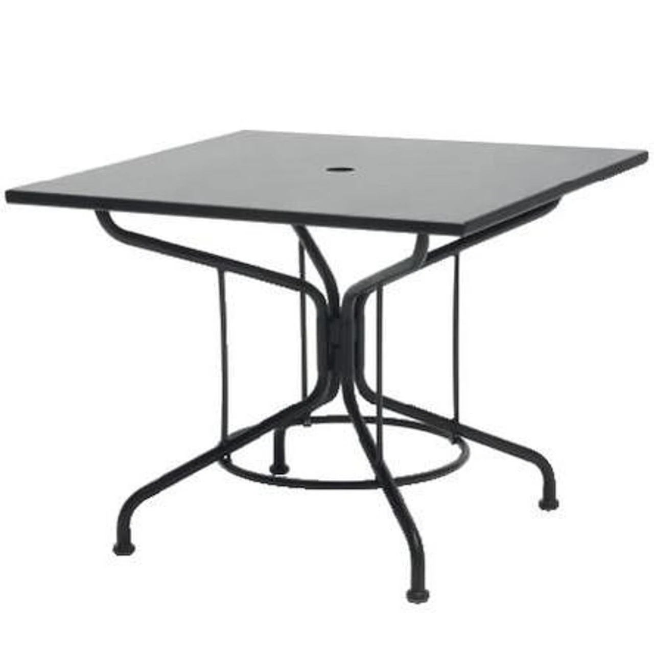 Item shown in Textured Black Finish. Table Shown is a 36″ square mesh top bistro table (Main Image) Sub image below shows the solid top option. Black wrought iron bistro set includes either 2 or 4 chairs and 1 bistro table. Woodard In-Stock Collection