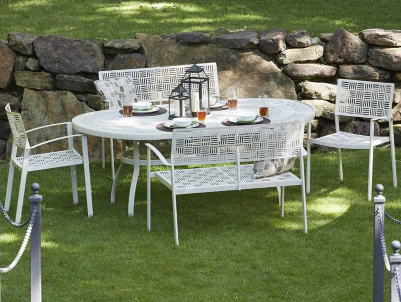 Our Woodard New Century Dining Set includes the following: (2) New Century Stackable Dining Armchairs, (2) New Century Stackable Dining Benches & (1) Large Aluminum Oval Trellis Top Umbrella Table. Throw Pillows in main image not included in above price.