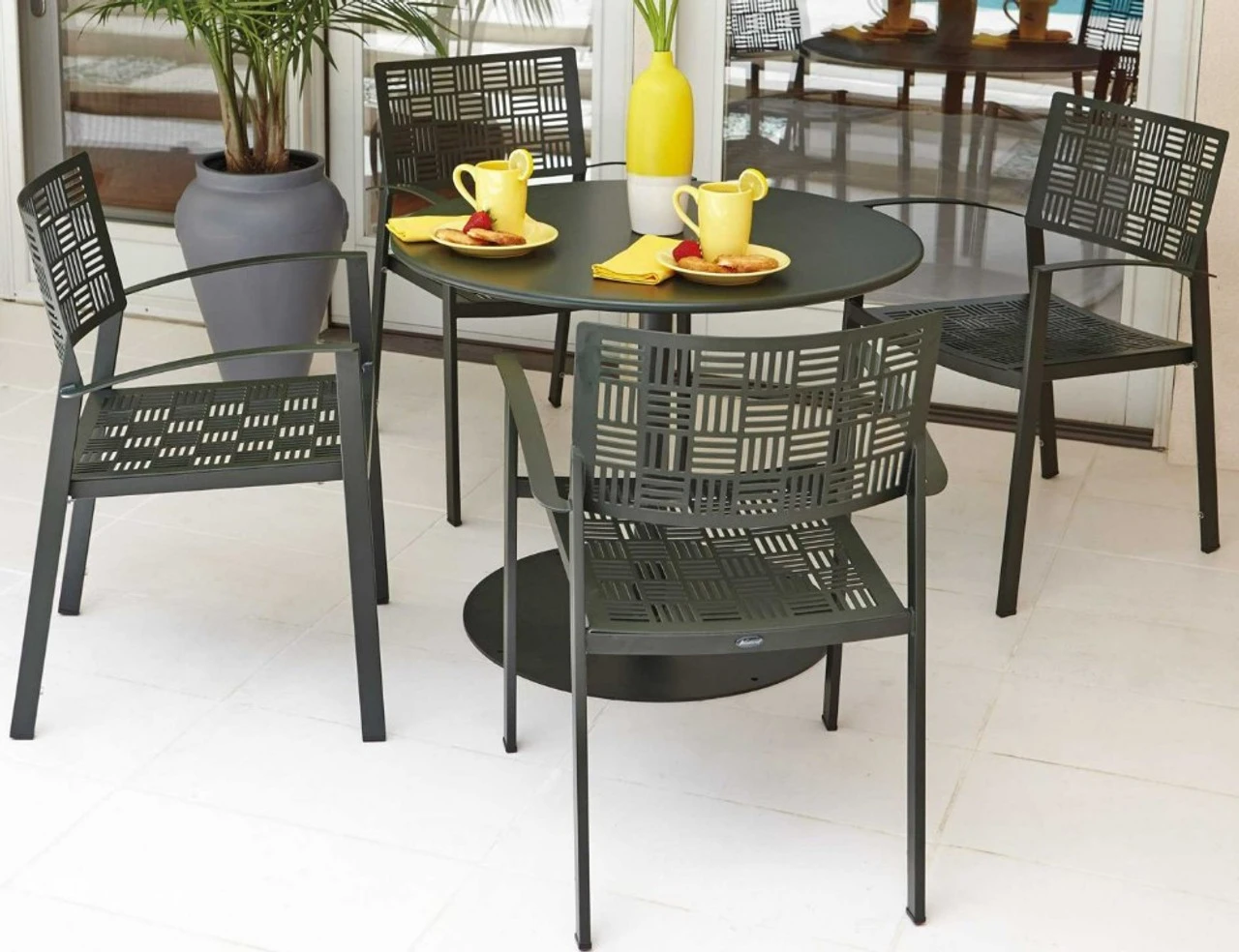 Our Woodard New Century Dining Set includes the following: (4) New Century Stackable Dining Armchairs & (1) 36″ Pedestal Umbrella Table.